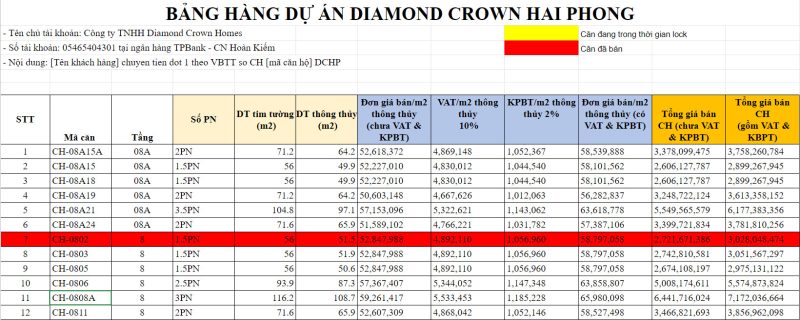BẢNG GIÁ DỰ ÁN DỰ ÁN DIAMOND CROWN HẢI PHÒNG