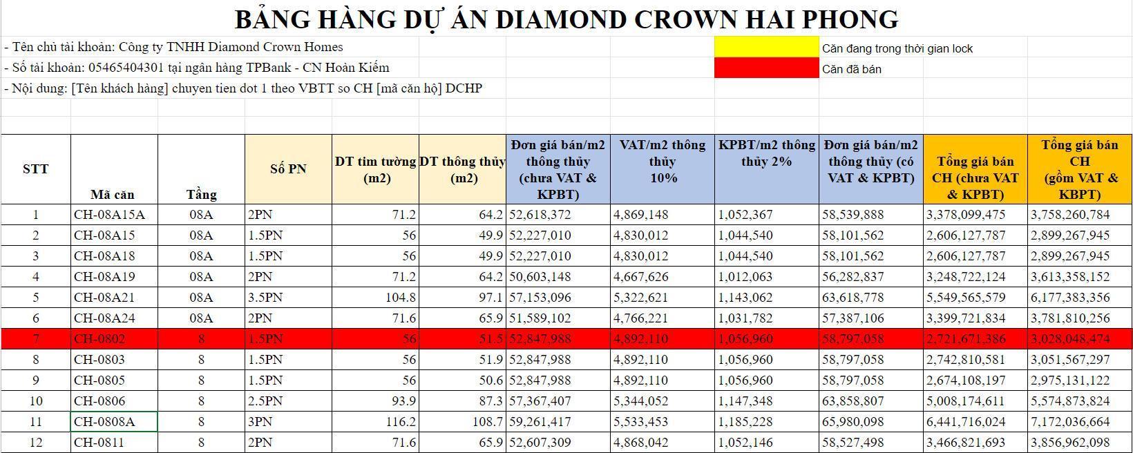 BẢNG GIÁ DỰ ÁN DỰ ÁN DIAMOND CROWN HẢI PHÒNG