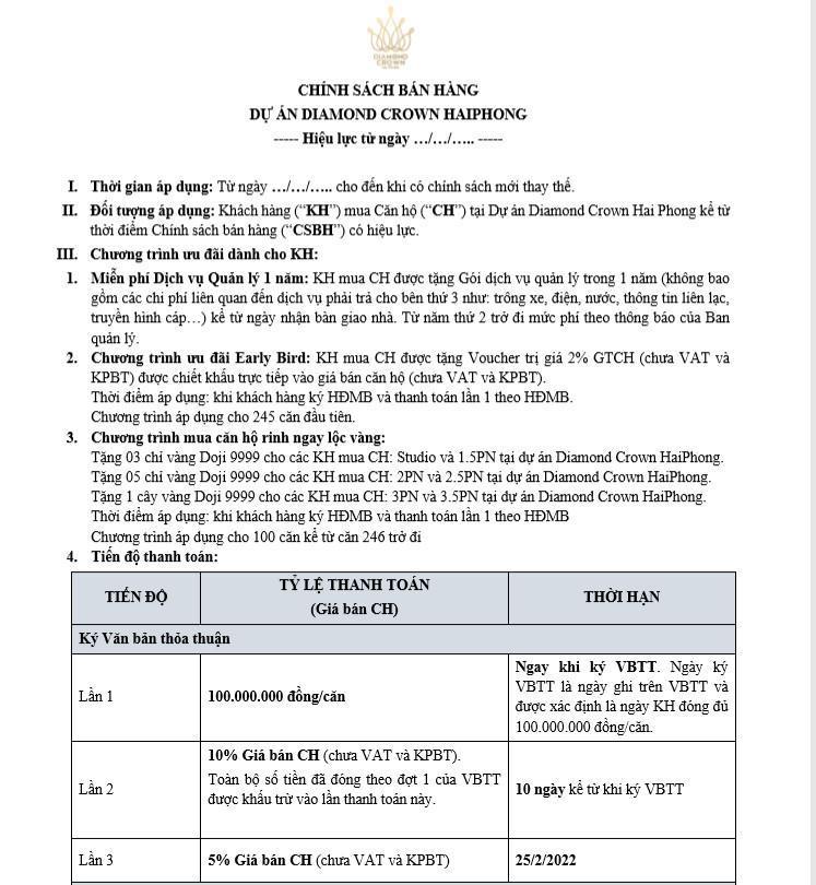 CHÍNH SÁCH BÁN HÀNG DỰ ÁN DIAMOND CROWN HẢI PHÒNG