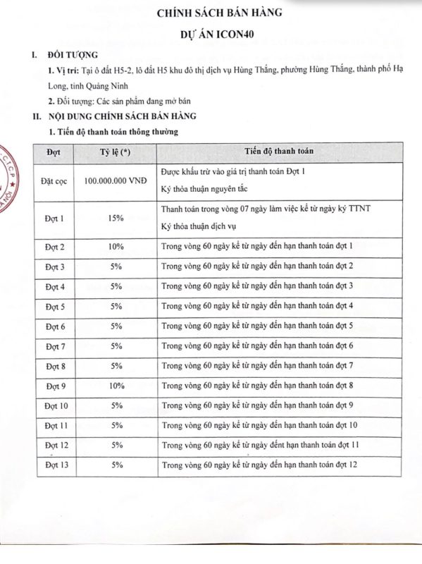 Tiến độ thanh toán dự án Icon 40 Hạ Long: