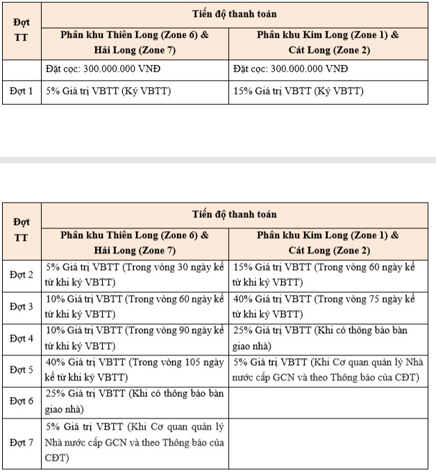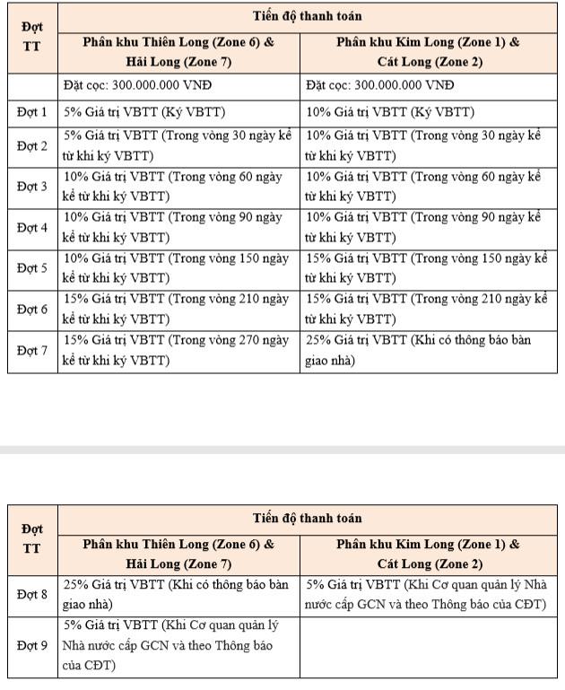 – Quyền lợi khách hàng: Chiết khấu 6,5% Giá trị VBTT các sản phẩm Biệt Thự Nội Khu thuộc phân khu Thiên Long (Zone 6), Hải Long (Zone 7); Chiết khấu 6% Giá trị VBTT cho các sản phẩm Biệt Thự Mặt Hồ, Biệt Thự Sân Golf, Shophouse Mặt Đường thuộc phân khu Thiên Long (Zone 6), Hải Long (Zone 7); Chiết khấu 4% Giá trị VBTT các sản phẩm thuộc phân khu Kim Long (Zone 1), Cát Long (Zone 2); – Điều kiện được hưởng: Khách hàng hoàn thành nghĩa vụ tài chính và ký VBTT theo quy định.